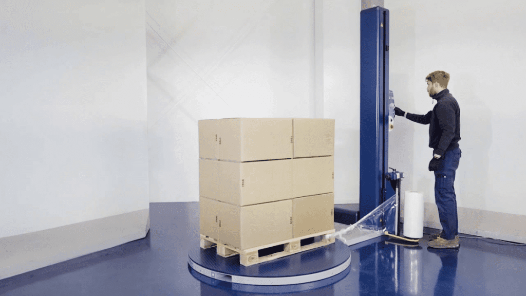 Basicamente, essa máquina possui uma base giratória que aplica o filme em torno da carga, proporcionando estabilidade, proteção e segurança durante o transporte e armazenamento.